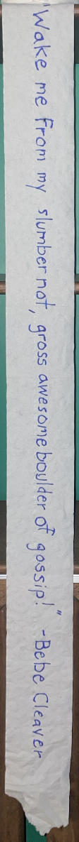 ** * Honesty! Honesty! THE LAST THING I want is to be accused of being a simpleton. Is this thing on? Oh. ** Well I don't know what I think! * * I'm a man who has lived many lives, isn't that important? I've sold cars, I've played games, I've fallen off a jet-ski, I've [unintelligable], I had a one-sided love affair twice, [Long coughing fit] I've gotten shot in the back, been castrated by the court of my peers, sublimated myself for the media circus, done an ecommerce photoshoot, I've even worked in tech. ** I've dabbled in it all, you see, but at the end of the day when I'm all alone I return to it again and again. My perfect * * seminal quote that I live by. * [Another long coughing fit] But no one else wants to speak in absolutes anymore. And, like I said, the last thing I want is to be accused of being a simpleton. [unintelligable murmur] But am I so wrong for wanting that perfect mantra? Live every day like it's your last. And is it dishonest that my opinion changes violently, drastically, and unpredictably? Sometimes, maybe. [10 seconds of coughing] The truth is that I don't believe the power of words is always greater than the power of silence. What good are words with this terrible case of brain fog? I can barely spell. [I could not for the life of me make out what he said here either -- Lindsay] I'd like to think that I would have been a scribe in Ancient Egypt but deep down inside I know that I'm lying to myself.